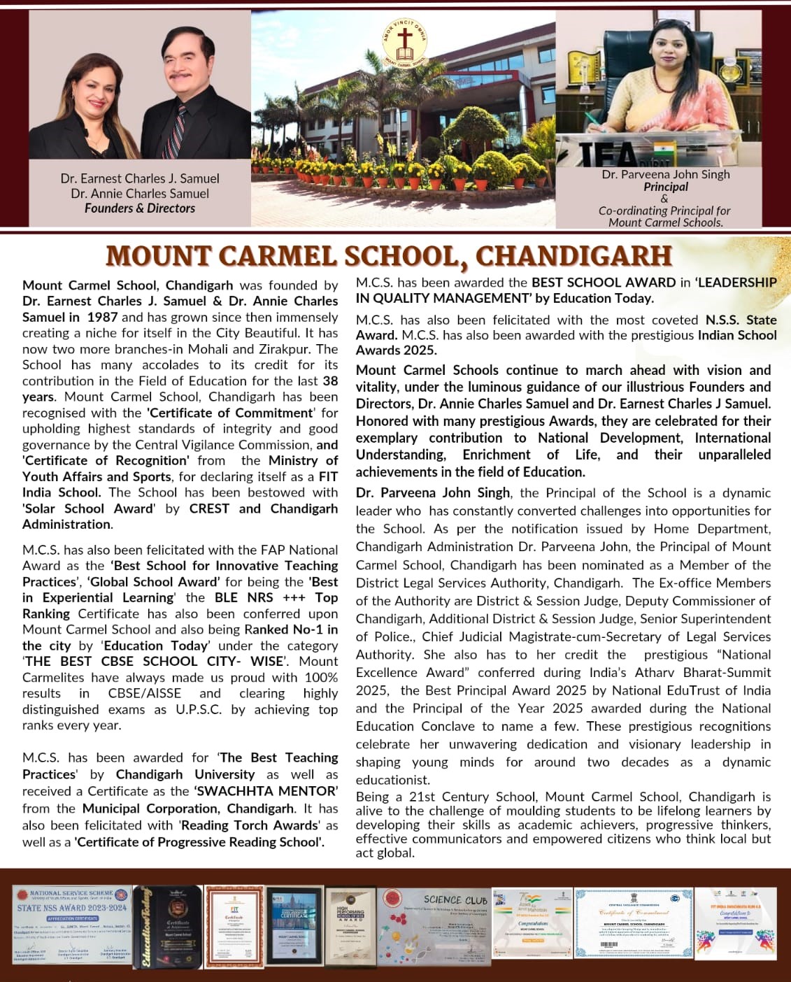 Mount Carmel School (A Christian Minority Institution) is a Senior Secondary School being run under the aegis of Mount Carmel Educational Society, Chandigarh (Regd.), a group of Christian teachers, dedicated to the cause of complete moral, intellectual, Spiritual and social development of boys and girls.